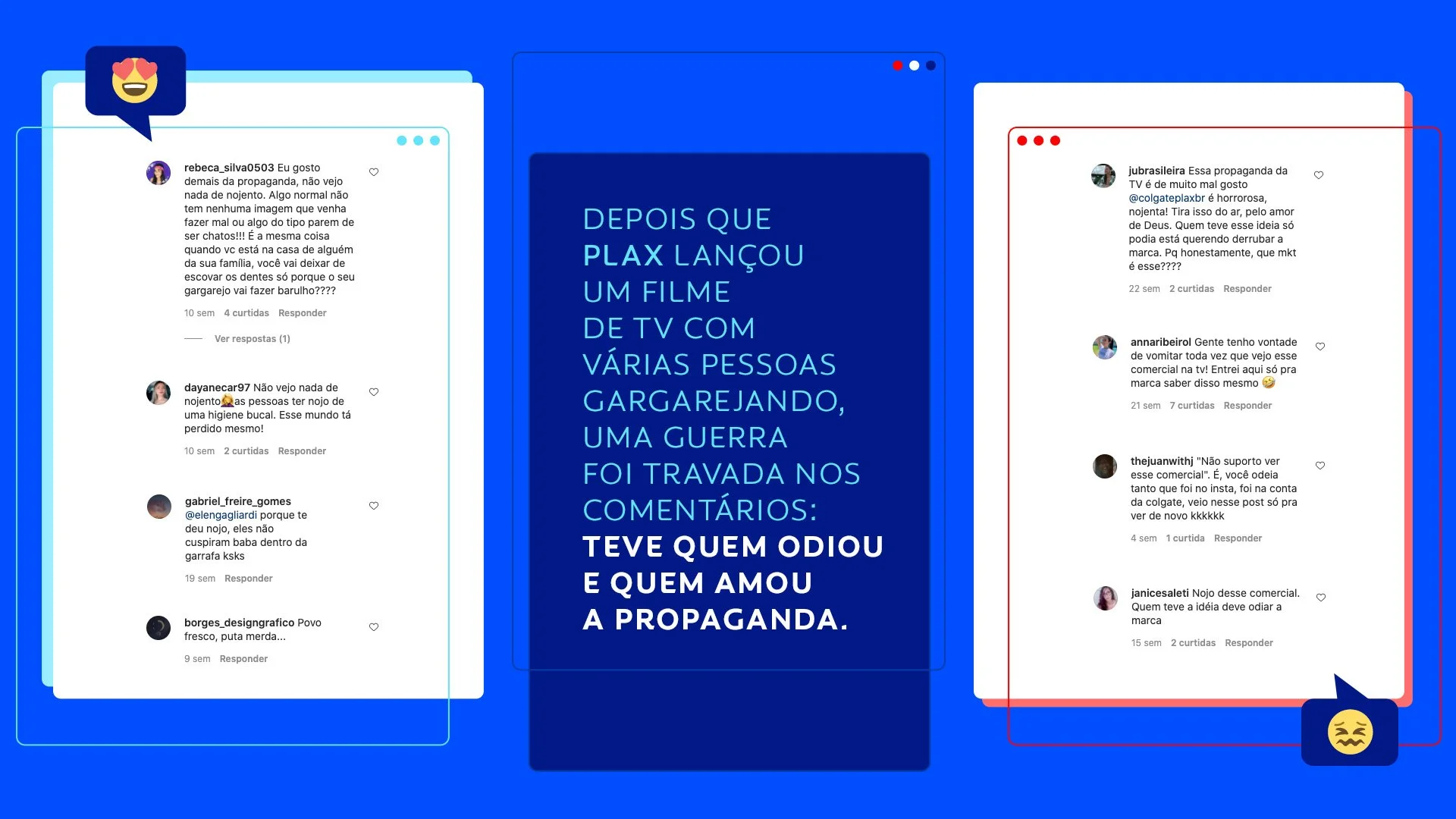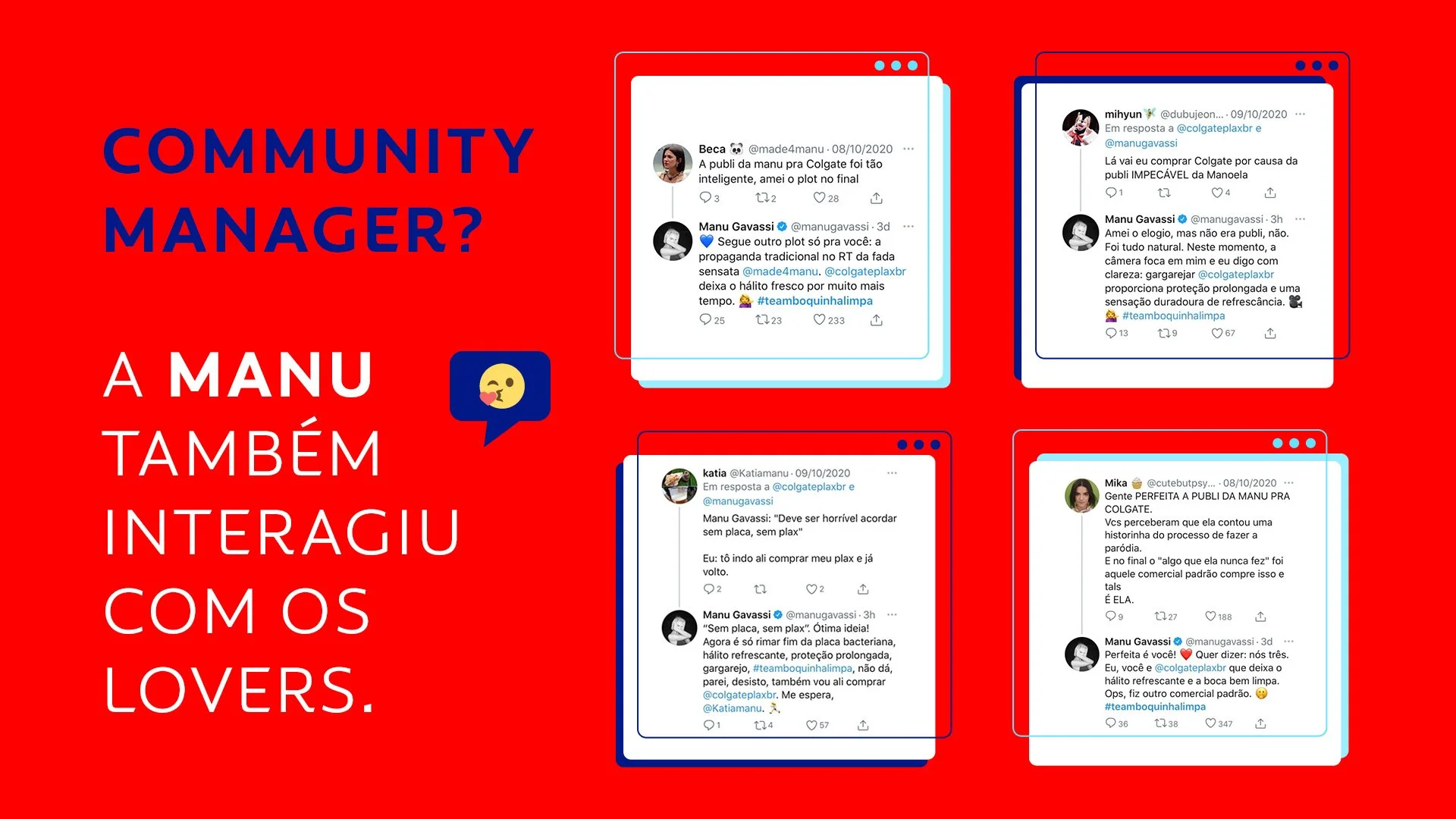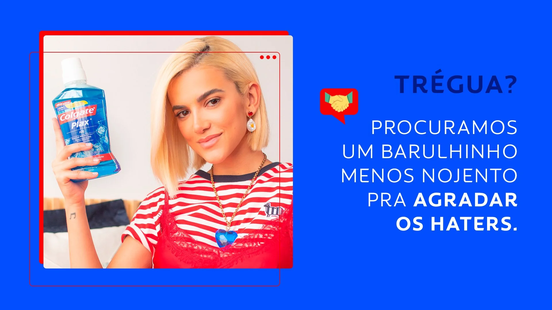 Para vencer os haters na internet, só com muito amor e bom humor. E foi o que fizemos quando Colgate Plax estava no ar com um TVC que gerou comentários negativos no Twitter sobre o uso do som do gargarejo do produto no seu filme. Nos unimos aos lovers da marca e à Manu Gavassi com um tema de campanha que parodiava a música “Deve ser horrível dormir sem mim”, recém lançada por ela na época.