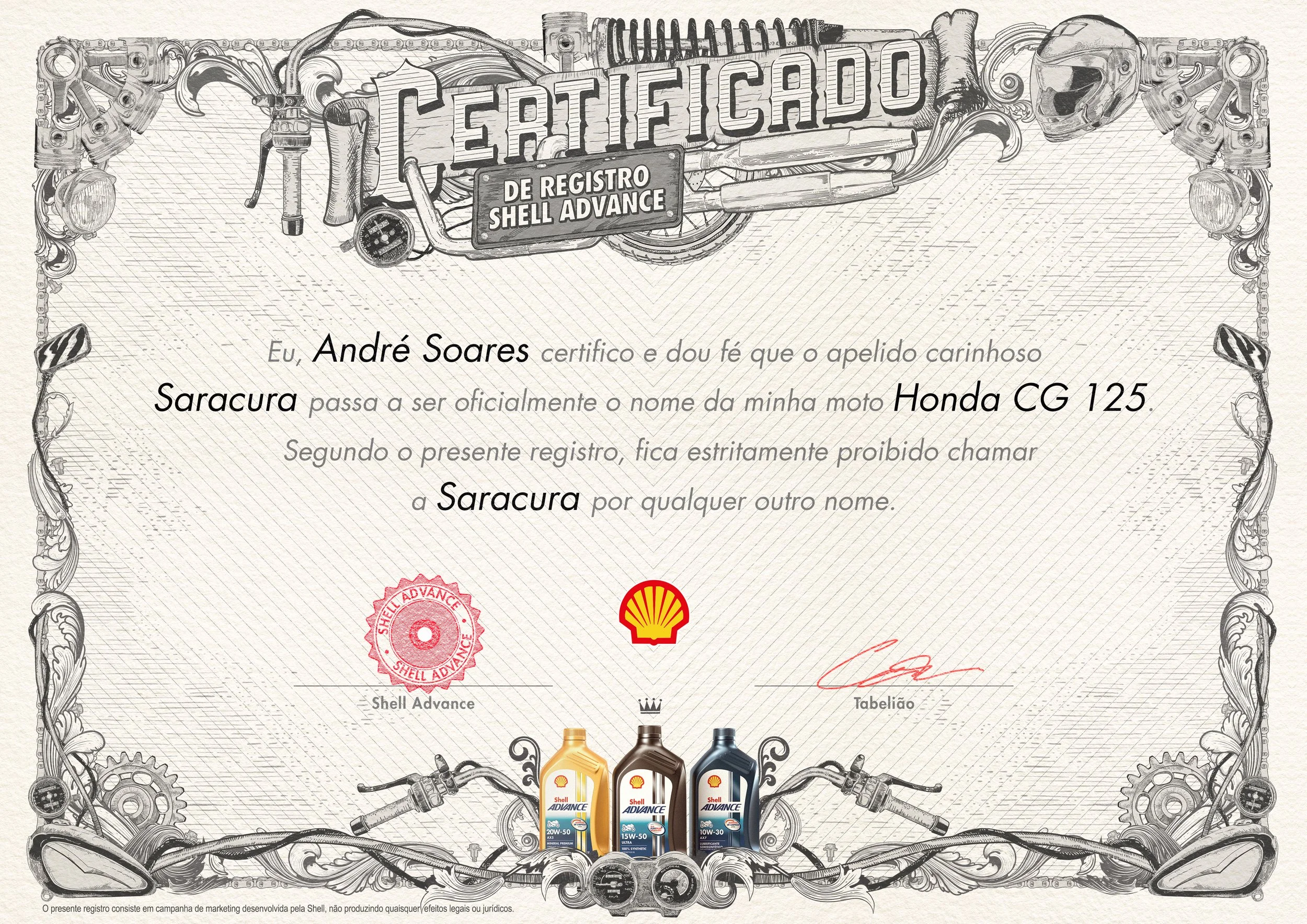 Donos de motos são realmente apaixonados por suas companheiras de 2 rodas, chegando ao ponto de dar apelidos carinhosos para elas. Que tal então oficializar essa verdadeira declaração de amor? Com Shell Advance, óleo lubrificante específico para motos, esses apelidos viraram nomes registrados em cartório.
